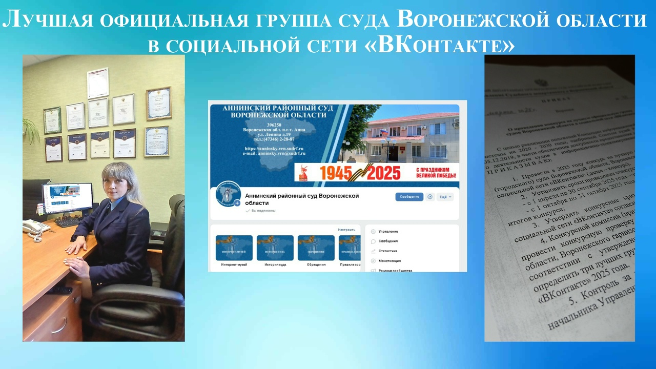С целью реализации положений Концепции информационной политики судебной системы на 2020-2030 годы, одобренной Советом судей Российской Федерации 05.12.2019, в части обеспечения доступности предоставления достоверной информации о деятельности судов в информационно-телекоммуникационной сети «Интернет», Управлением Судебного департамента в Воронежской области проведен конкурс на лучшую официальную группу районного (городского) суда Воронежской области, Воронежского гарнизонного военного суда в социальной сети «ВКонтакте». Членами комиссии отмечены высокие результаты информационного наполнения страниц «ВКонтакте» Аннинского, Калачеевского, Бобровского, Бутурлиновского, Таловского, Острогожского районных судов и Борисоглебского городского суда. За проявленные добросовестное и образцовое исполнение должностных обязанностей по ведению и информационному наполнению официальных страниц судов в социальной сети «ВКонтакте», высокую исполнительскую дисциплину и степень ответственности за результаты работы, проявленные в рамках конкурса победители награждены денежной премией. ![]() |