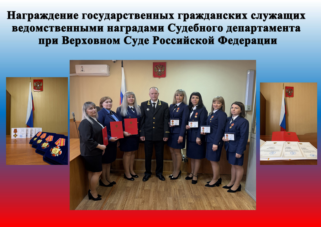За значительный личный вклад в развитие судебной системы, всестороннее содействие в укреплении и совершенствовании правосудия в Российской Федерации знаком отличия Судебного департамента при Верховном Суде Российской Федерации «За усердие» II степени награждены: - Дорошина Марина Сергеевна – администратор суда; - Безрукова Юлия Николаевна – консультант; - Лубкова Анастасия Владимировна – помощник судьи; - Седова Татьяна Александровна – секретарь судебного заседания